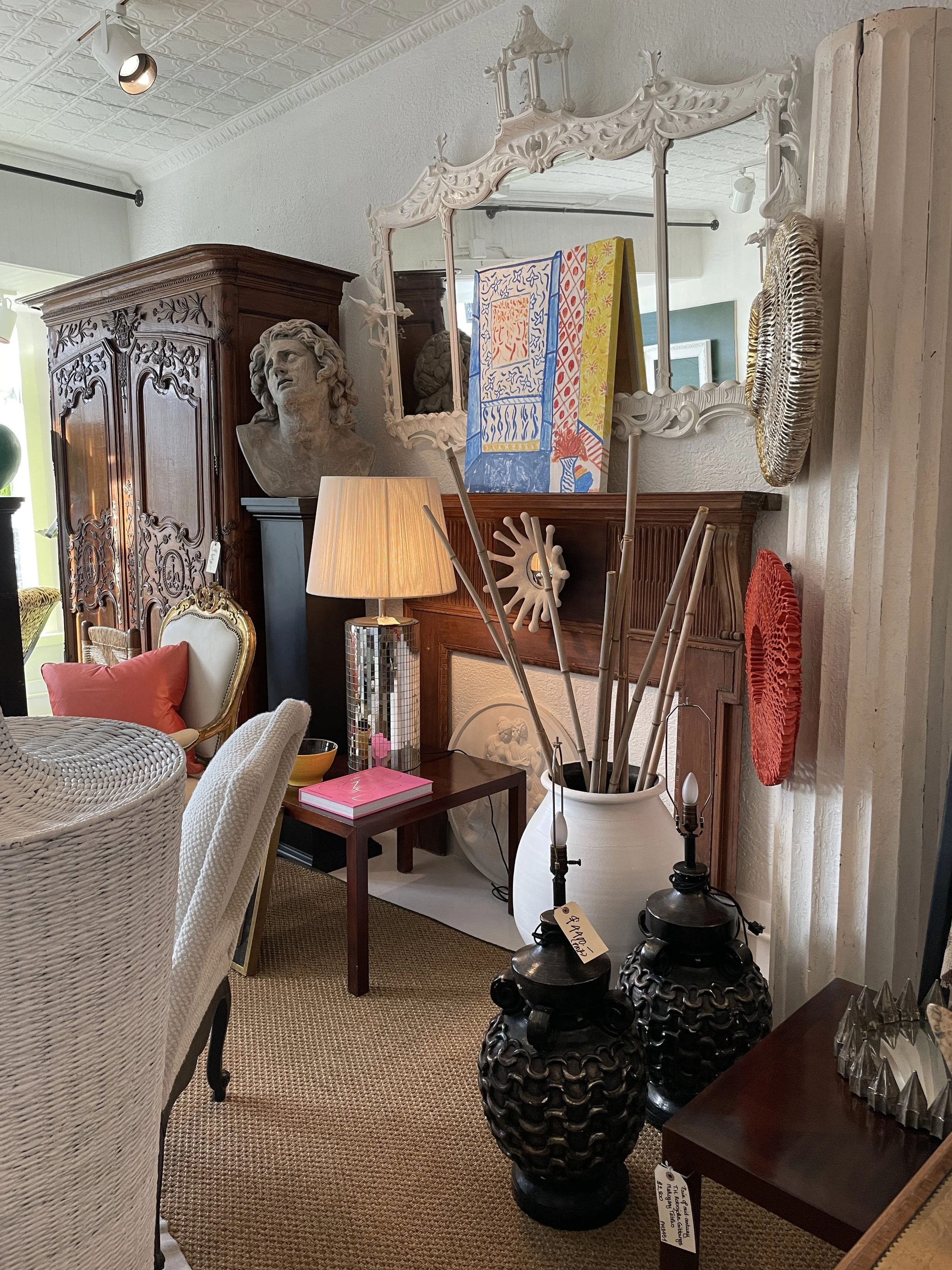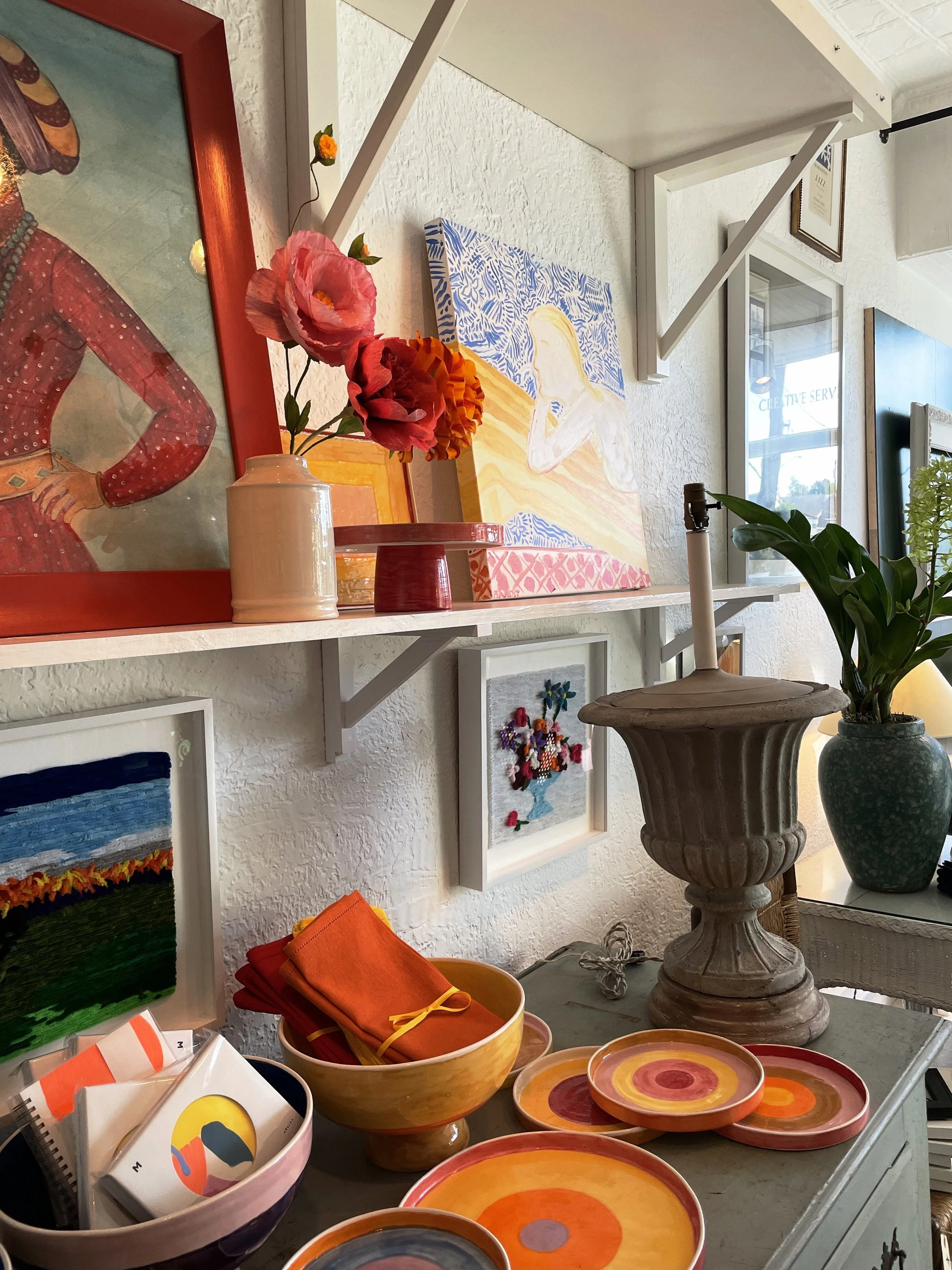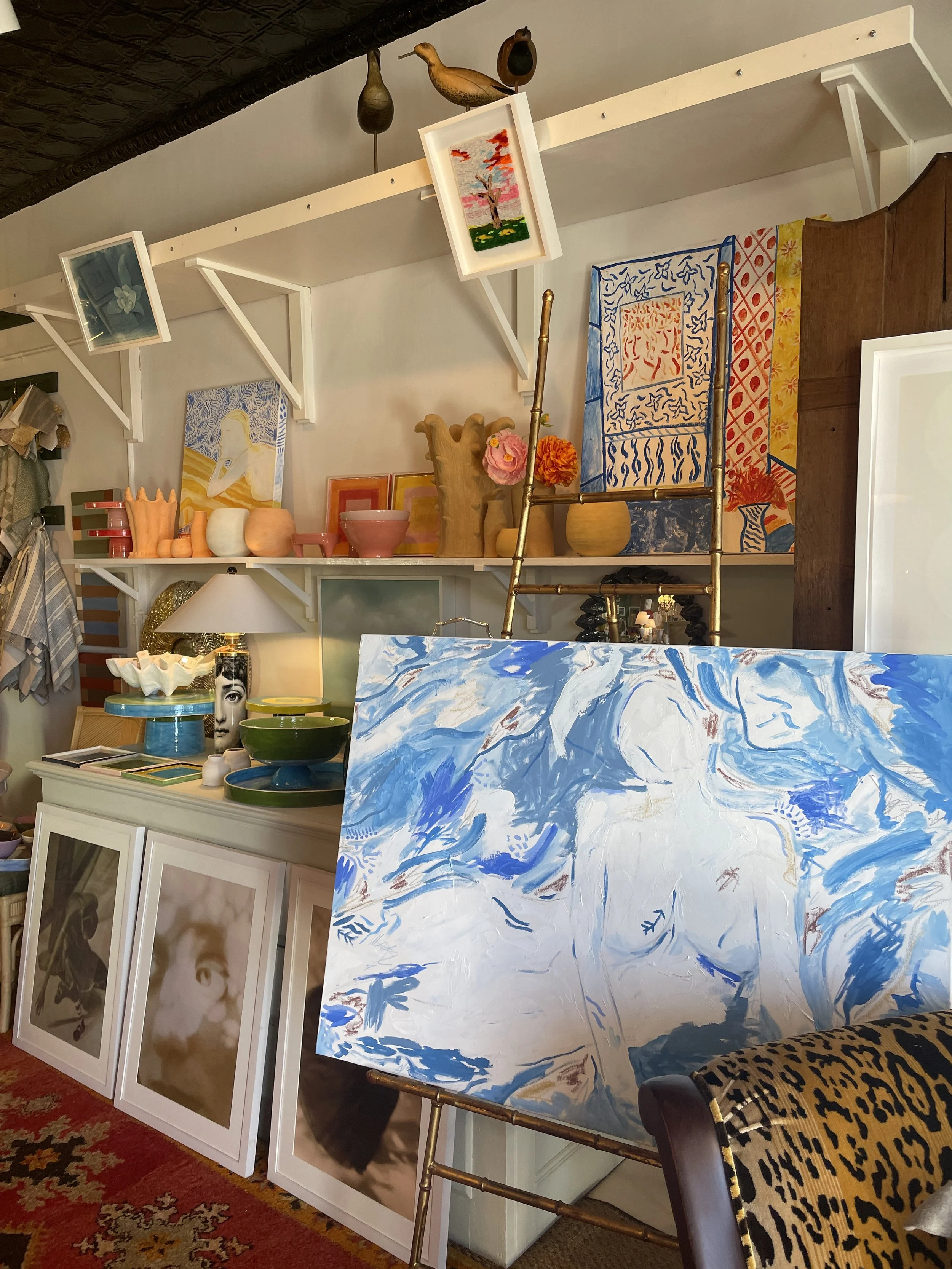 My summer 2022 series of bright, colorful, works blended perfectly with Patrick’s retail store adorned with antiques, classical sculptures, unique ceramics and contemporary art.